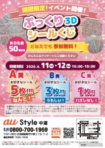 2026年4月11日(土)から12日(日)の2日間、 au Style 中道にてシールくじイベント開催!